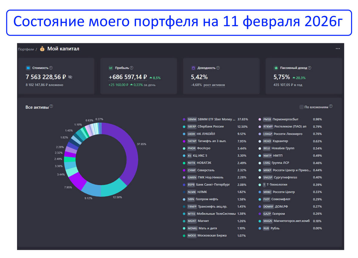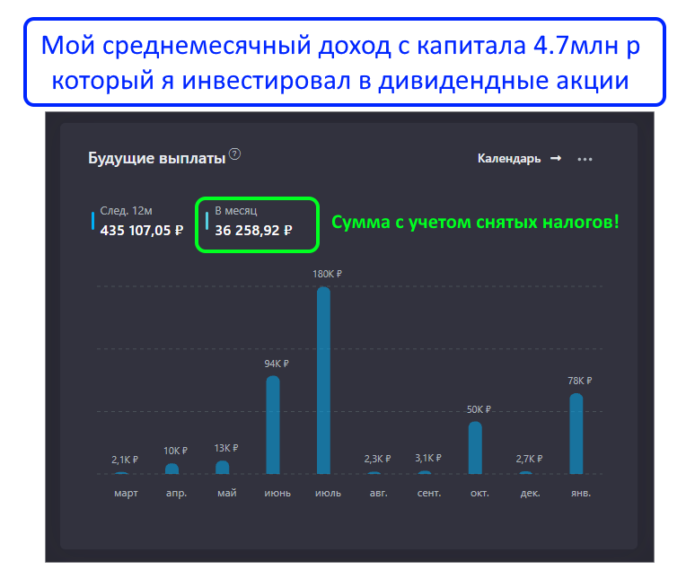 У меня уже есть фундамент. Тот капитал, что вложен в акции (это 4,7 млн рублей), сейчас генерирует около 36 000 рублей в месяц: