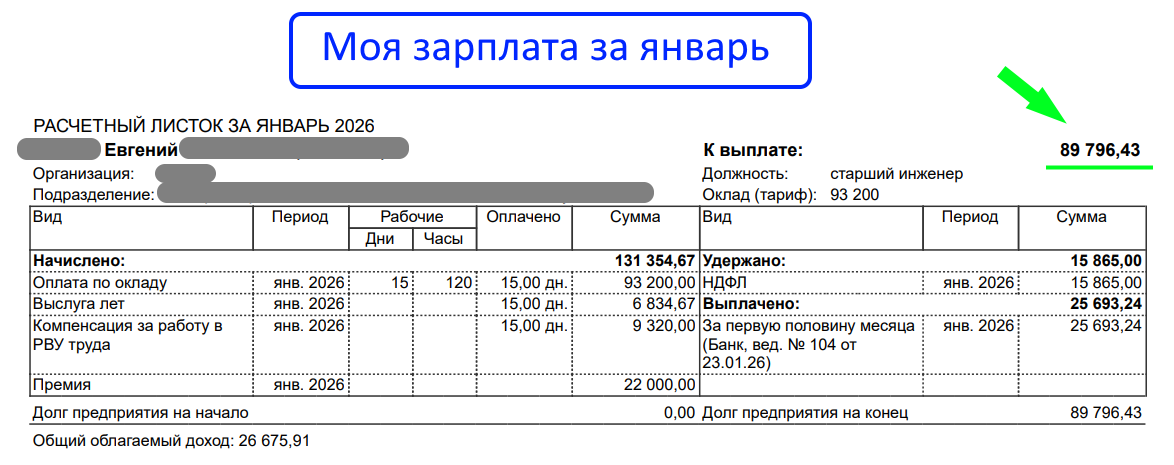 Я работаю инженером, и в месяц у меня выходит на руки порядка 100–120 тысяч рублей. Зарплату нам выдают частями, два раза в месяц. В этот раз я получил 89 000 рублей (это сама зарплата, аванс был около 25 000 рублей):