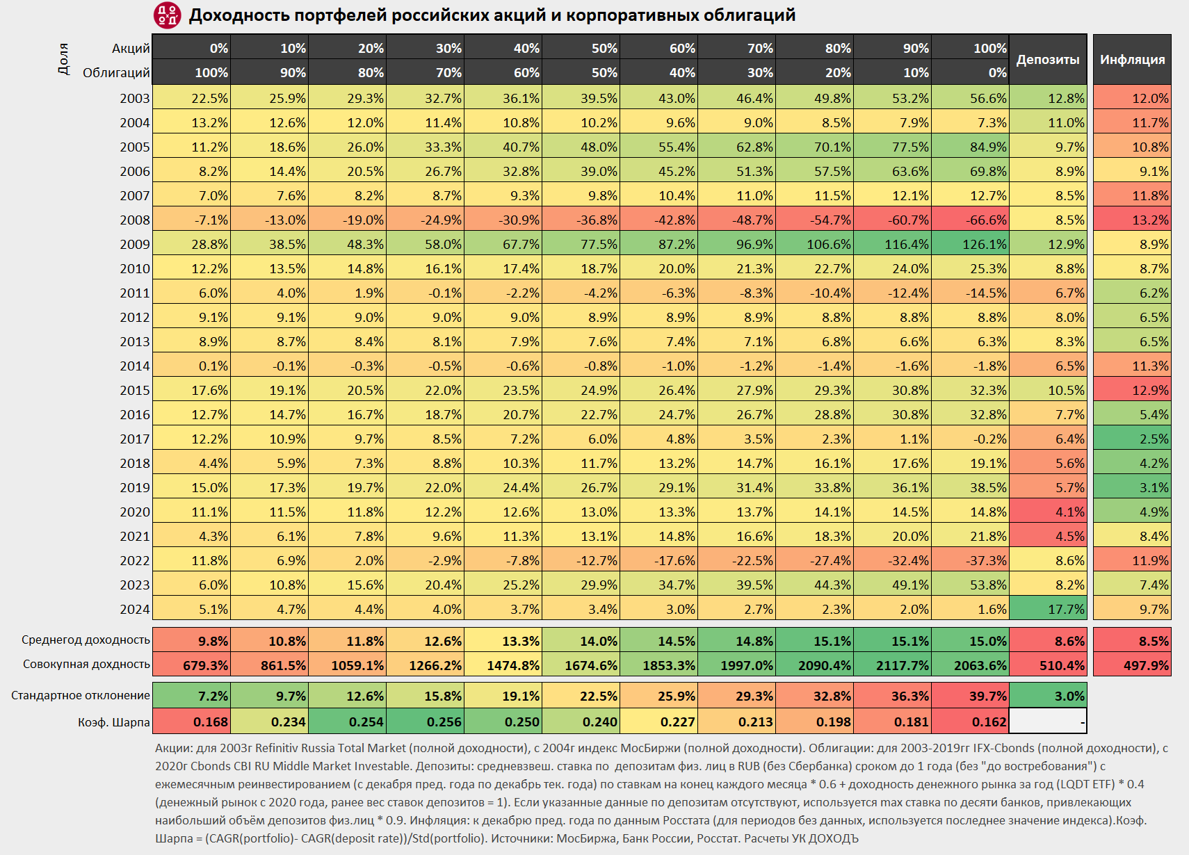Долго не решался добавлять облигации в свой портфель, но психологическая составляющая взяла вверх, когда в феврале, марте и апреле сидел без выплат, дивиденды обычно не платят компании, за редким исключением. Потом еще натолкнулся на исследование, проведенное УК Доход, где за период в 20 лет соотношение 90/10 (90% акций, 10% облигаций) показало самую лучшую доходность по сравнению с другими.