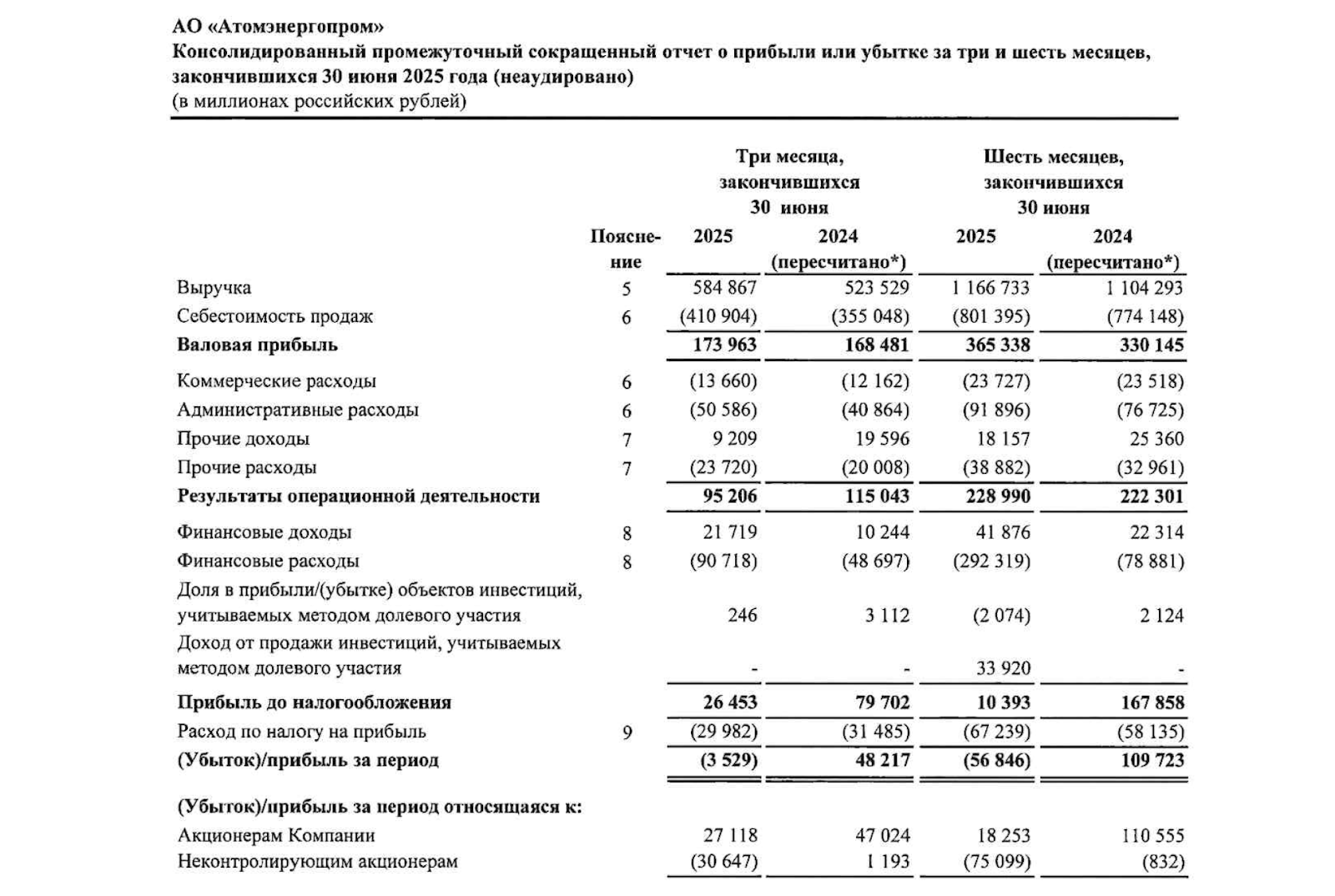За 1П2025 чистый убыток Атомэнергопром по МСФО составил 56,85 млрд рублей (годом ранее — прибыль 109,72 млрд рублей).
