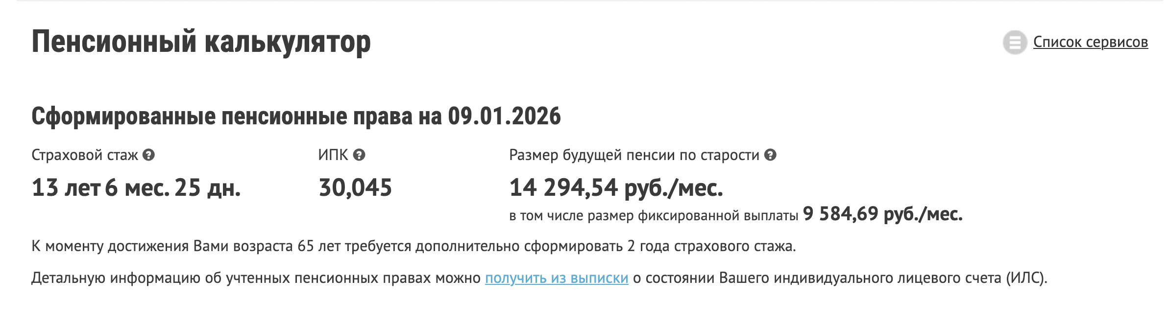 Пенсионный калькулятор мне выдает вот такие данные на 9 января: