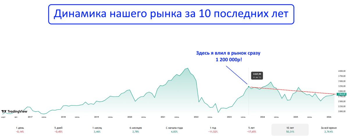 Но в итоге я пропустил почти всё дно. Целый год не инвестировал, а когда рынок улетел на +30% вверх за полгода, начал закупаться уже по высоким ценам.