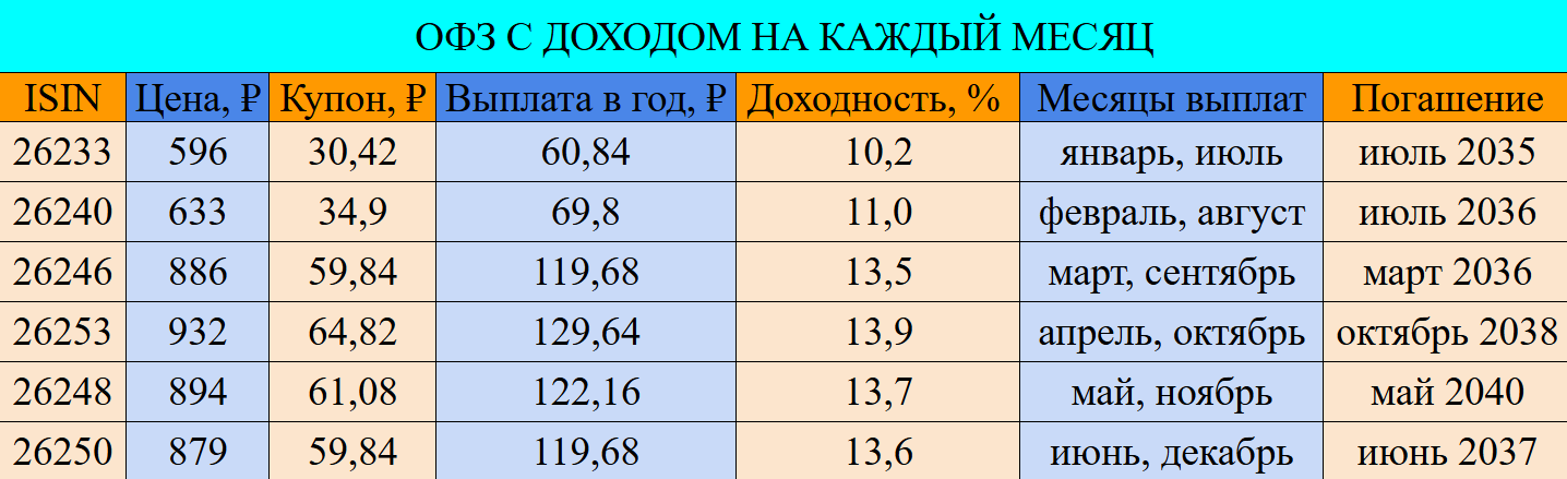 6 ОФЗ для получения ежемесячного дохода