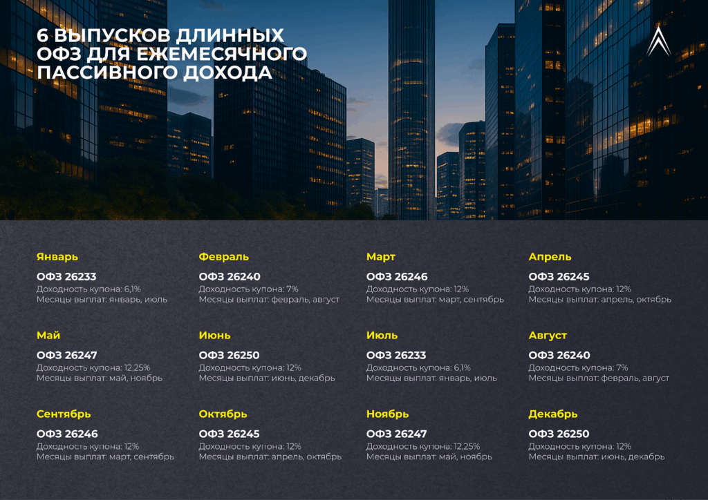 Изи! Помогла мне в этом вот эта супер табличка от Smart-Lab: https://smart-lab.ru/q/ofz/order_by_next_coupon/asc/ — вы сами можете поставить фильтры по дате ближайшего купона и выбрать те облигации, что подходят вам по срокам и доходности. 26 серия — это постоянный купон. Остальные в таблице подписаны (ПД, ИН, АД). Там же вся актуальная информация по текущей доходности и датам выплат.