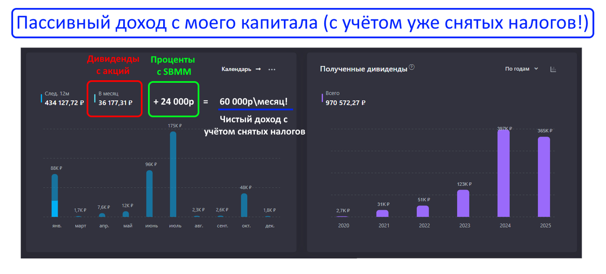 Итого, среднемесячный пассивный доход составляет 60 000 рублей. И это сумма уже после уплаты всех налогов!