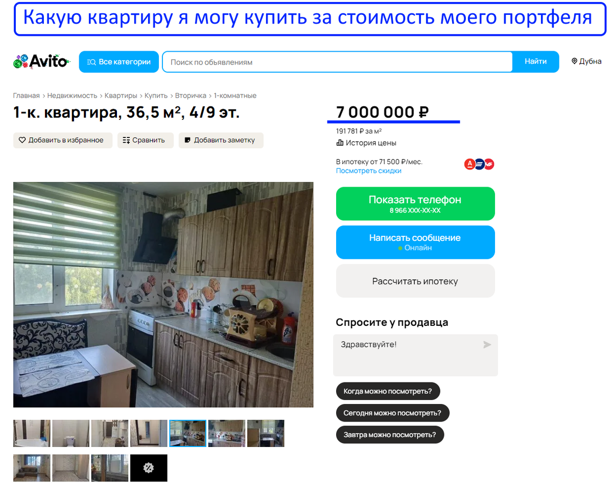Предположим, я решаю продать все свои активы и вложиться в недвижимость. На 7 млн рублей в моём городе (Дубна, Московская область) можно купить только однокомнатную квартиру с обычным ремонтом. Например такую:
