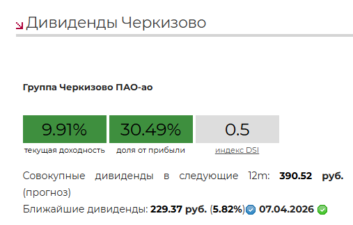 И всё бы хорошо, НО! Черкизово выплачивает дивиденды при условии коэффициента Чистый долг/скорр. EBITDA < 2,5х. На конец 2025г этот коэффициент = 2,5х . То есть ровно на грани. Есть вероятность, что компания может урезать выплаты, чтобы не увеличивать долг.
