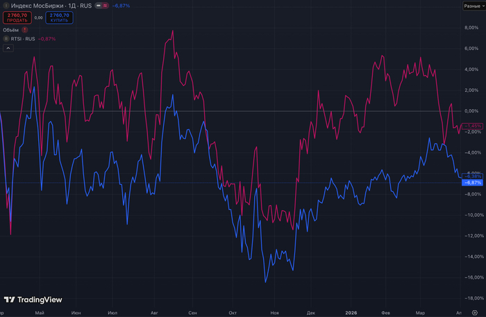 Красный — индекс RTS, синий — индекс Мосбиржи:
