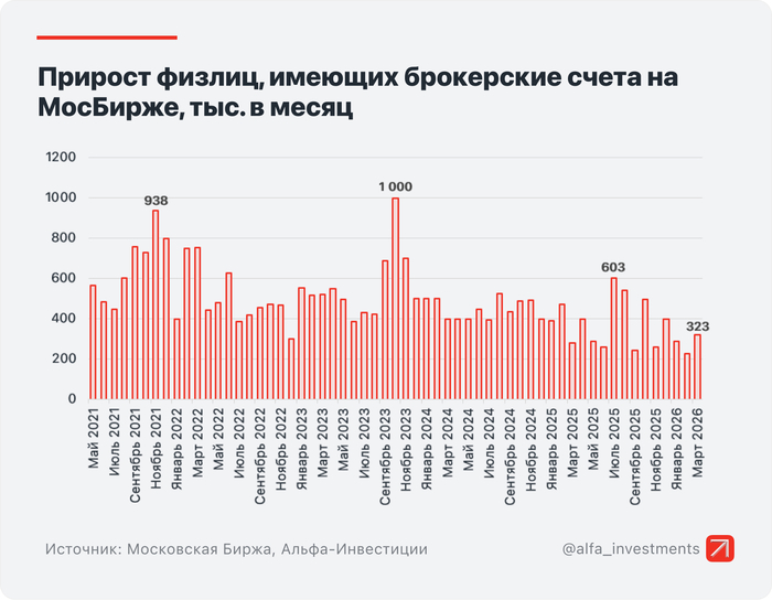 Число физлиц, имеющих счета на Мосбирже, за март увеличилось на 322 тысячи и достигло 41 млн, ими открыто более 78,3 млн счетов. В Марте было 3,2 млн активных инвесторов.