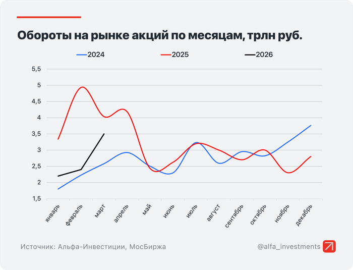 Объём торгов акциями, депозитарными расписками и паями составил 3,5 трлн рублей (2,4 трлн рублей месяцем ранее).