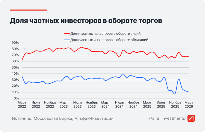 Доля физлиц в объёме торгов акциями и паями биржевых фондов составила 67,2%, в объёме торгов облигациями — 10,2%.