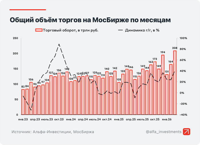 Общий объём торгов составил 208,3 трлн рублей (163,9 трлн месяцем ранее). Хорошо поторговали!