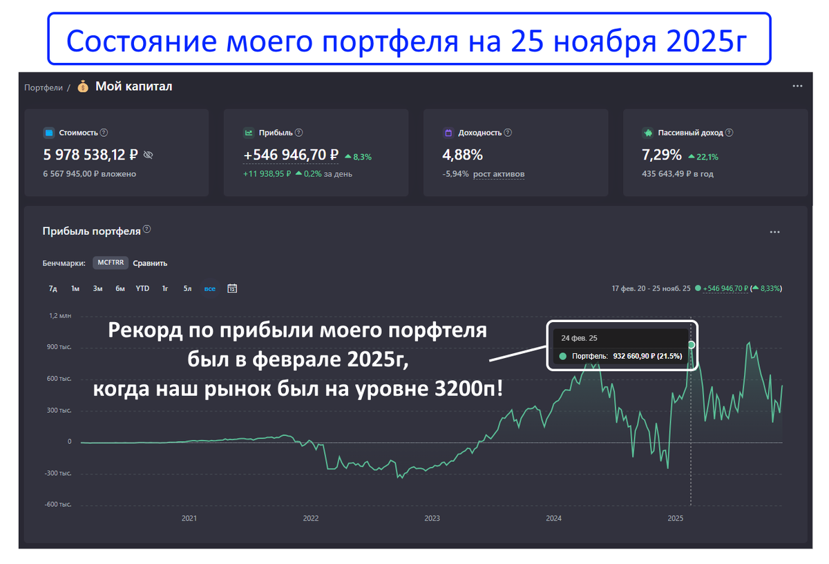 Я инвестирую почти 6 лет и я помню, когда рынок был на отметки 3200п, мой портфель тогда показывал рекордную доходность почти в 1 000 000р чистой прибыли (скрин моего портфеля из сервиса учёта инвестиций):