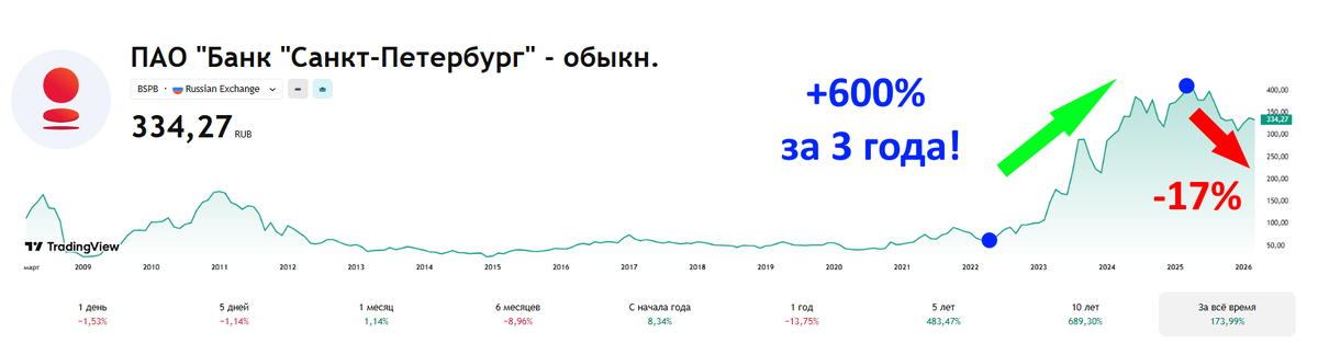 После начала СВО бумага переписала свои исторические максимумы и за 3 года выросла на 600%. Котировки разгоняли рекордные финансовые отчеты и двузначные дивиденды.