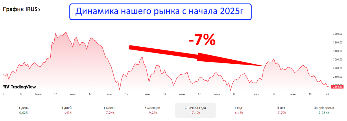 На текущий момент российский фондовый рынок находится в состоянии снижения, с начала 2025г индекс Мосбиржи упал на -7%: