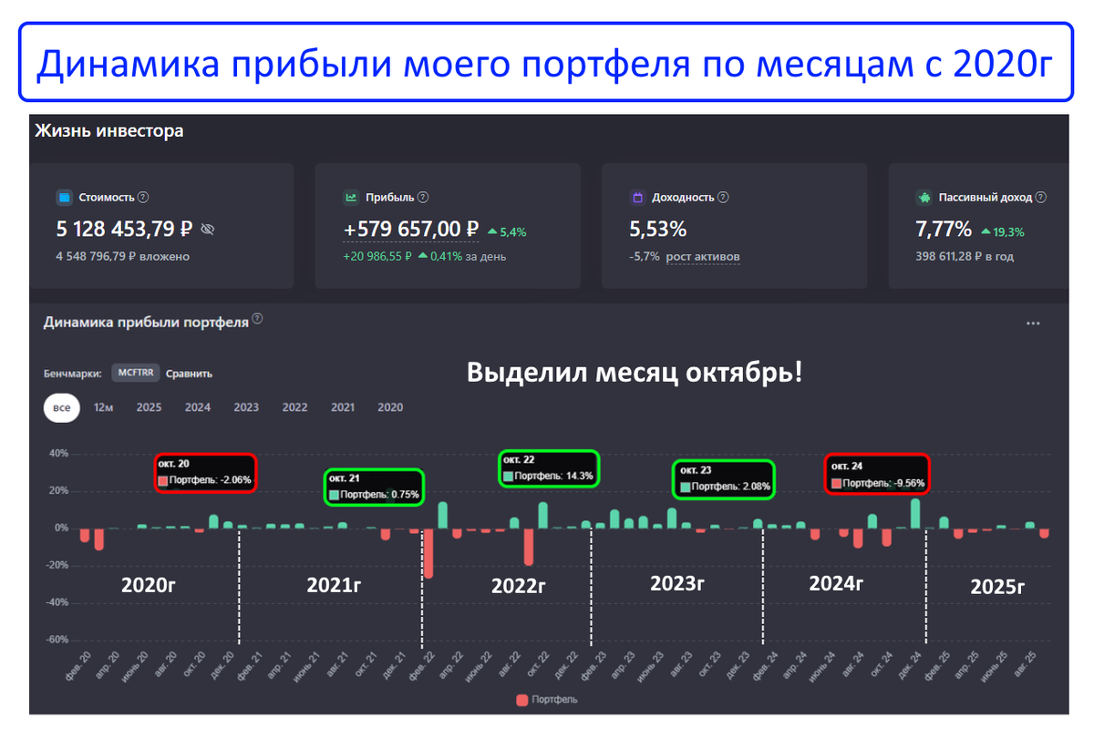 Я инвестирую почти 6 лет и у меня есть данные по динамике моего инвестиционного портфеля в каждом октябре, начиная с 2020г (скрин моего портфеля из сервиса учёта инвестиций):