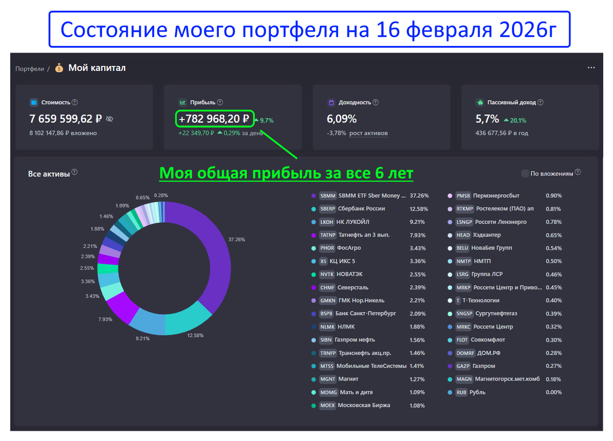 Если я прямо сейчас закрою все позиции и выйду из рынка, чистая прибыль за 6 лет составит 782 000р. В пересчёте на год — около 6% среднегодовой доходности.