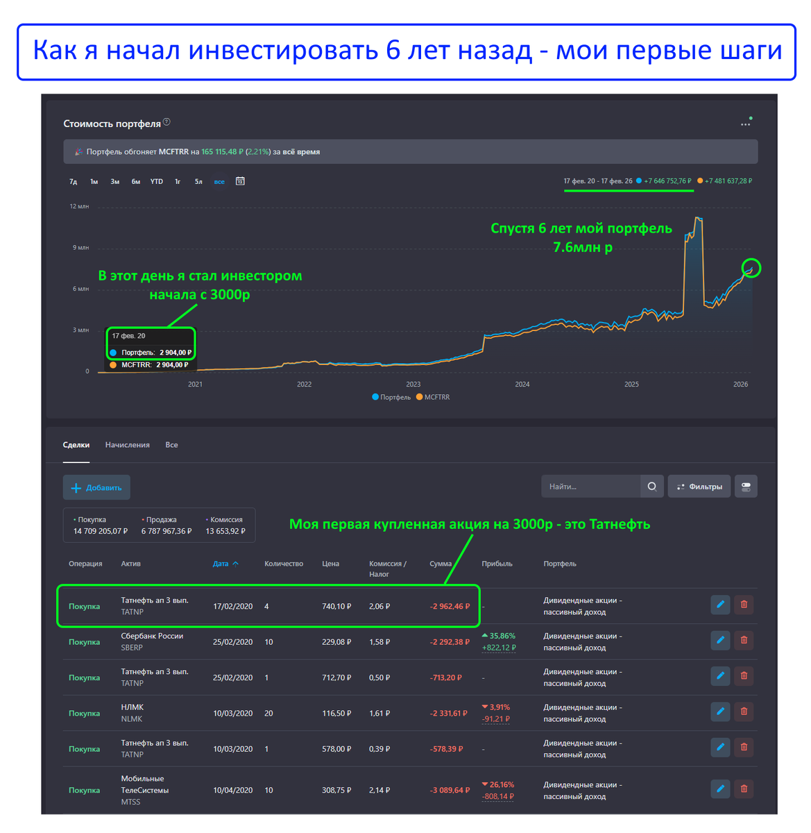 17 февраля 2020г, ровно 6 лет назад, я стал инвестором! Мой путь начался ровно с 3000р, именно столько я положил на брокерский счет в Сбере и купил на эти деньги свои первые акции Татнефти: