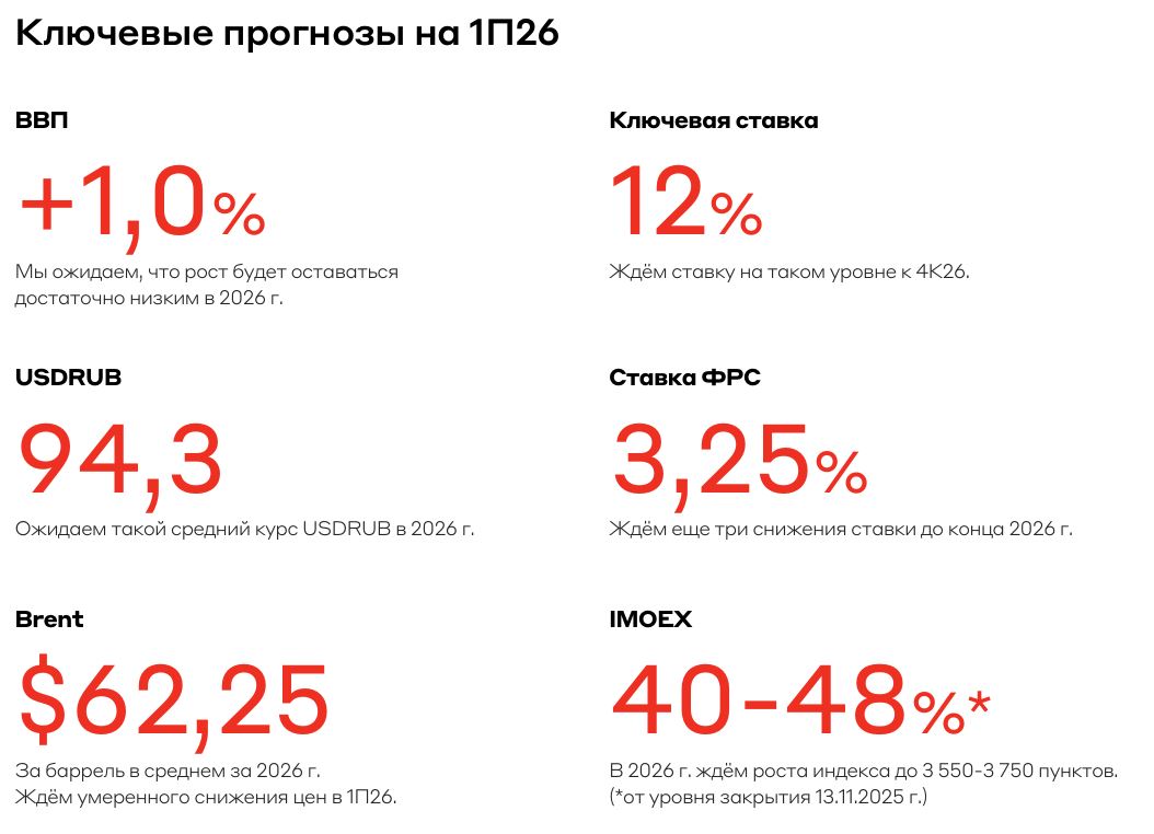 «Мы полагаем, что первое полугодие 2026 года будет непростым для российского рынка акций – на него продолжат давить геополитическая неопределенность и санкционные риски (особенно вторичные), а также высокая стоимость заимствований. Исходим из того, что ставка ЦБ по меньшей мере до июня продержится на уровне 15%, негативно влияя на привлекательность рынка акций».