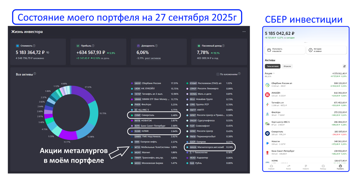 В моём портфеле акции металлургов занимают немаленькую долю - почти 7% от всего капитала (скрин состава портфеля из сервиса учёта инвестиций и приложения СБЕР инвестиции):