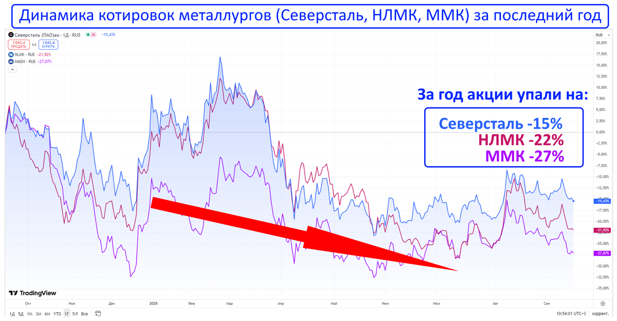 Так же стоит добавить санкции, проблемы с логистикой и поиском рынков сбыта. На фоне этого котировки акций металлургов упали на десятки процентов от своих максимумов: