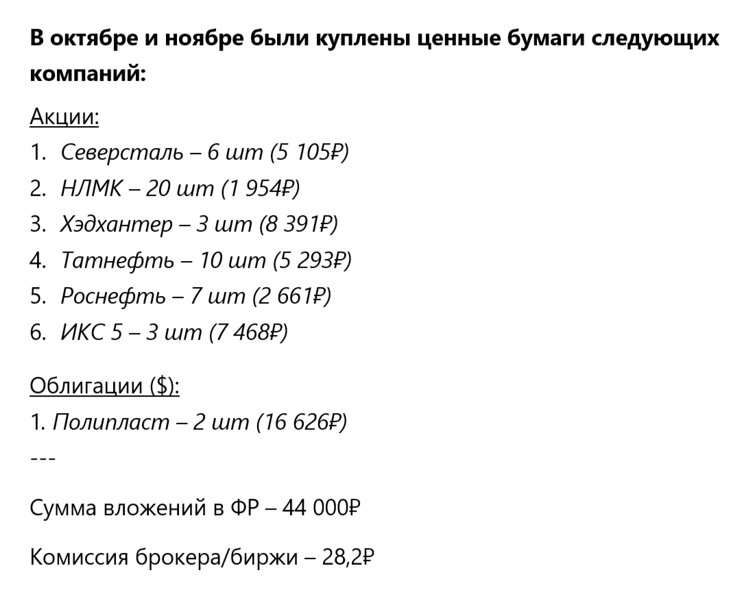 Посмотрим на результаты каждого блока по отдельности и в конце подведем общие итоги. Но сначала небольшой отчет о недавних покупках в нашем мини-фонде.