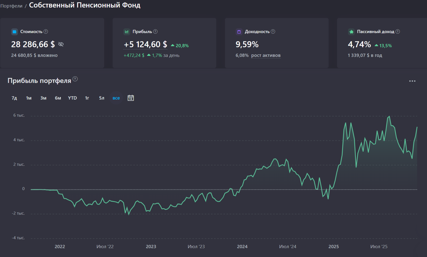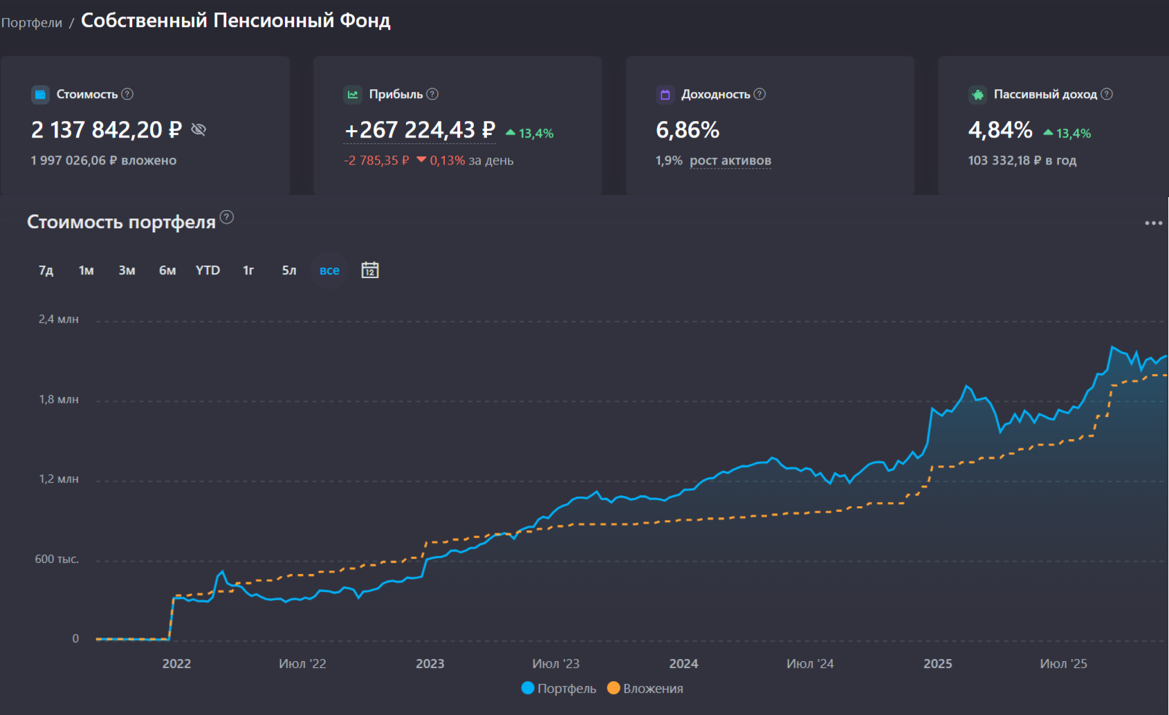 Стоимость Собственного Пенсионного Фонда закрепилась на уровне более 2 млн ₽, во многом благодаря активным пополнениям в 2025 году, так как доходность ИМБ с начала года отрицательная.