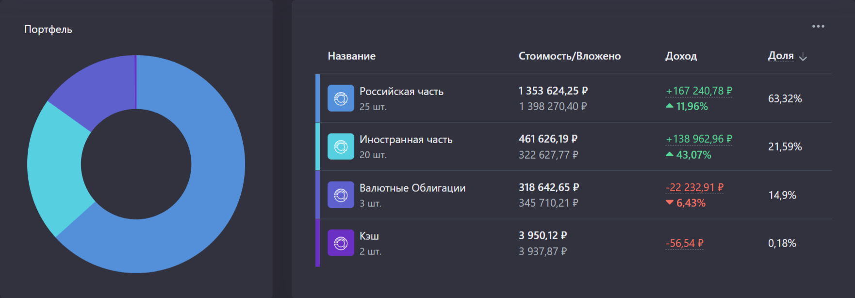 Одновременно самая доходная и самая печальная часть нашего пенсионного фонда. 20 иностранных компаний общей стоимостью 460 тыс. руб. представляют собой заблокированные активы нашего портфеля и составляют 21,5% от его стоимости.