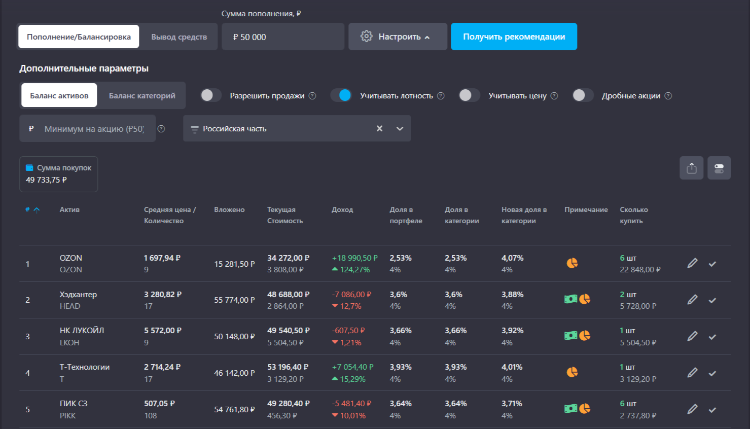 Необходимо выставить целевые веса, указать сумму пополнения и выбрать параметры балансировки. Что и сколько нужно купить — рассчитает сервис.