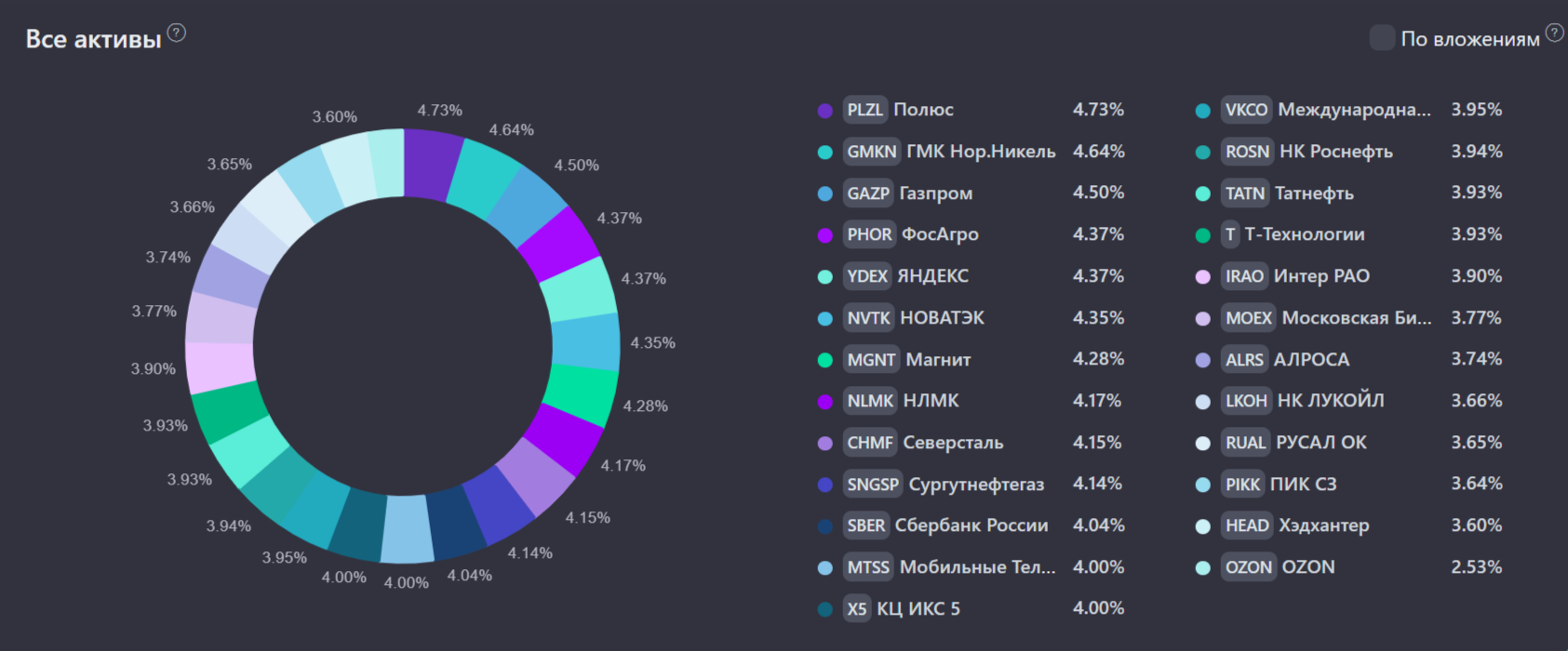 Костяк Собственного Пенсионного Фонда представляют 25 российских компаний из Индекса Мосбиржи, с целевым весом 4% каждая. Данная стратегия инвестирования называется равновзвешенной, ее придерживаюсь уже больше 3 лет.
