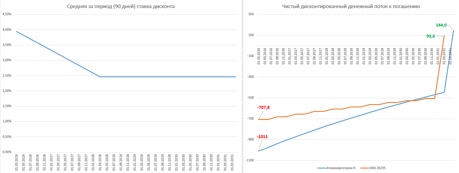 По этим параметрам Атомэнергопром сейчас выглядит сильнее. Его купоны лучше ложатся в проблемные для меня месяцы 3, 6, 9 и 12, а приведённая доходность оказывается выше именно потому, что высокая стоимость денег сохраняется достаточно долго.