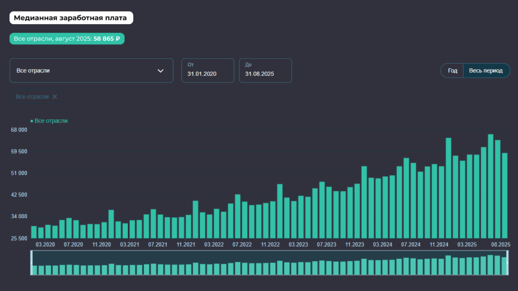 По данным СберИндекса, медианная зарплата в августе составила 58 865 рублей в месяц.
