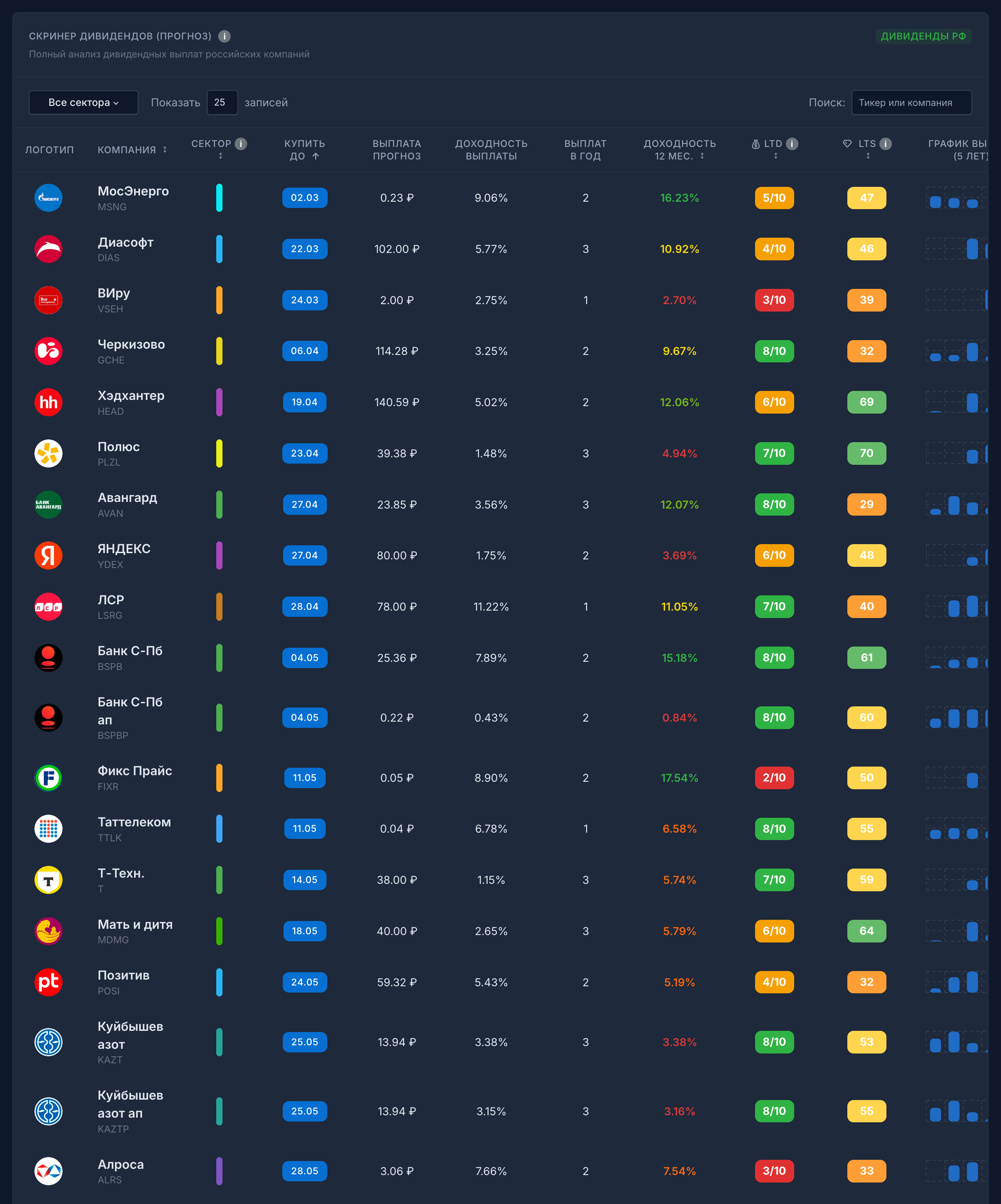 LTD (от 0 до 10) — индикатор надежности дивидендных выплат. Рассчитывается на основе 5-летней истории: регулярность выплат, выплаты за последний год, рост дивидендов в последние 3 года.