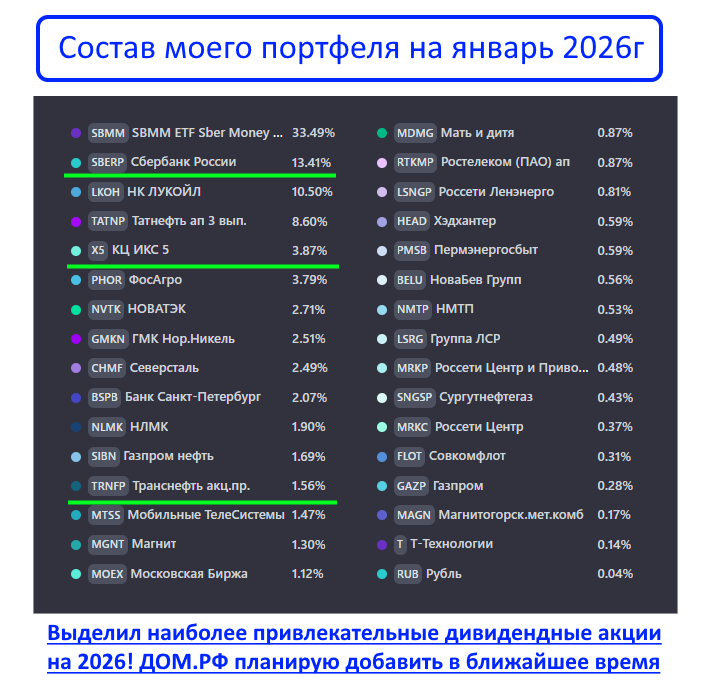 Мой фокус в 2026г — на компании с «обязательным» спросом на их услуги (энергетика, инфраструктура, потребительский сектор), прибыльным бизнесом без долгов и чёткой дивидендной политикой. СБЕР, Транснефть, ДОМ.РФ и ИКС 5 — это те акции, которые выглядят особенно привлекательно в преддверии дивидендного сезона 2026г.