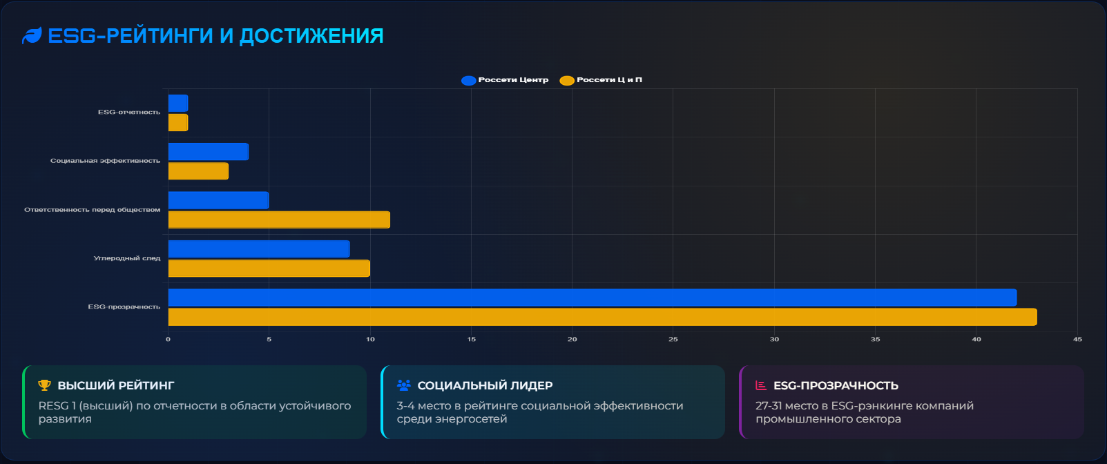 Высший рейтинг ESG-отчетности (RESG 1). Лидеры в социальной эффективности. Программа снижения выбросов на 10% ежегодно.