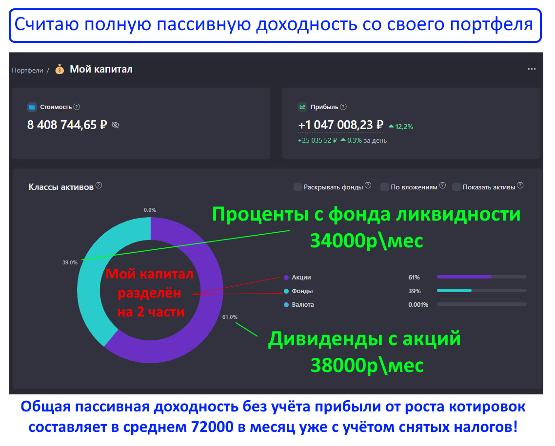 Мой портфель, который я собирал 6 лет, сейчас приносит мне пассивный доход более 72 000 рублей в месяц чистыми с учётом снятых налогов: