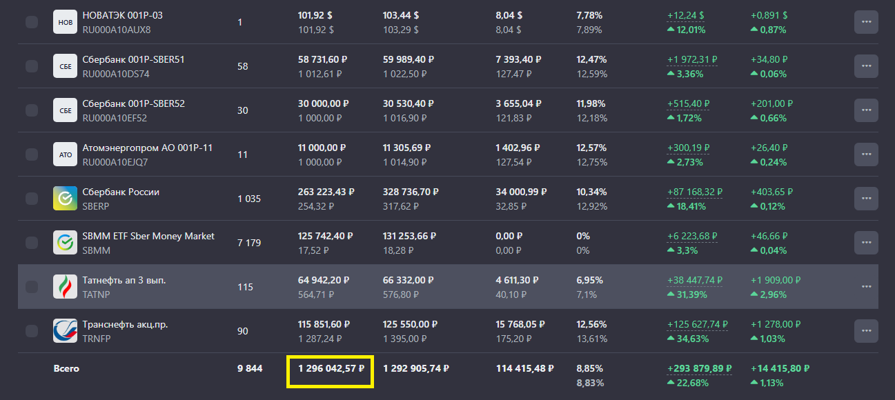 Объем портфеля 1 314 319 руб (согласно приложения брокера Сбер Инвестиции).