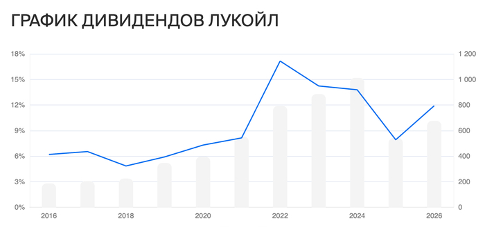 Традиционно Лукойл платит дивиденды дважды в год, так что отсечка уже 4 мая, а потом ещё в декабре или в январе — как повезёт. Майский див 278 рублей (5,1%).