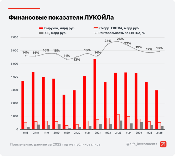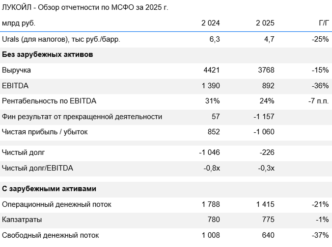 Чистый убыток по МСФО за 2025 год составил 1,06 триллиона рублей. Важно понимать, что этот убыток вызван разовым фактором: полное списание (обесценение) стоимости зарубежных активов компании (Lukoil International GmbH) на ₽1,67 трлн. Чистая прибыль от продолжающейся деятельности: ₽96,7 млрд.