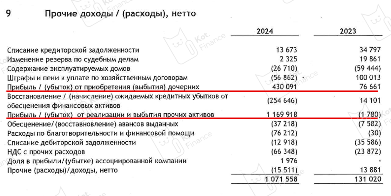 Но давайте разбираться с прибылью: из ₽1,2 млрд чистой прибыли 2024 года, ₽1,2 получено от выбытия прочих активов и ₽0,4 млрд от операций с дочерними компаниями. Ни первого, ни второго раскрытия в отчетности нет. Т.е. от основного направления убыток?