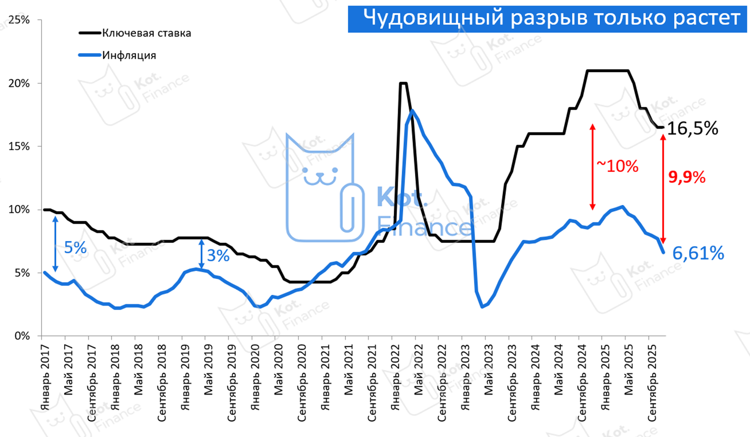 С одной стороны, данные по инфляции позитивны: ЦБ достиг цели на 2025 год, есть запас + впереди выбывание высокой базы 2024 года. Однако рост ставок по вкладам - сигнал, что на рынке дефицит ликвидности. При инфляции ниже 7% реальная ставка вновь стремится к 10% (по факту 9,9%), а на фоне обвала платежеспособного спроса это нонсенс, экономика этого долго не выдержит