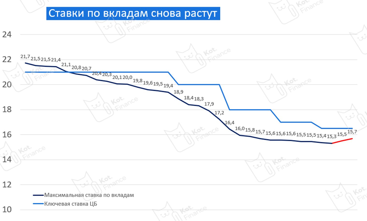 Разрыв между ключевой ставкой и инфляцией продолжает находиться на рекордных уровнях. И сюрприз: банковские вклады впервые за весь цикл смягчения ставки показали рост. Причем уже 2 недели подряд! Это прямой сигнал — ликвидность на рынке заканчивается