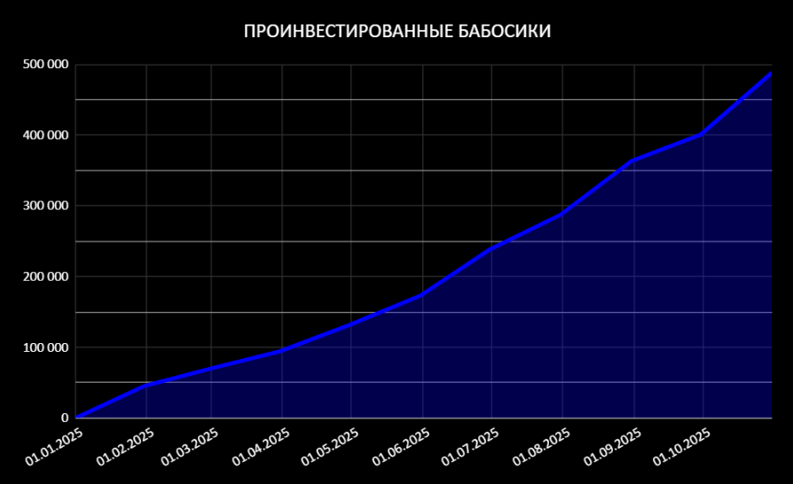 За десять месяцев пополнения извне на счет 342 000 ₽, реинвестирование на данный момент составляет 146 200 ₽. В общей сложности пока вышло 488 200 ₽. Вместе с реинвестом планирую приобрести активов минимум на полмиллиона рублей, как пойдет дальше, посмотрим.