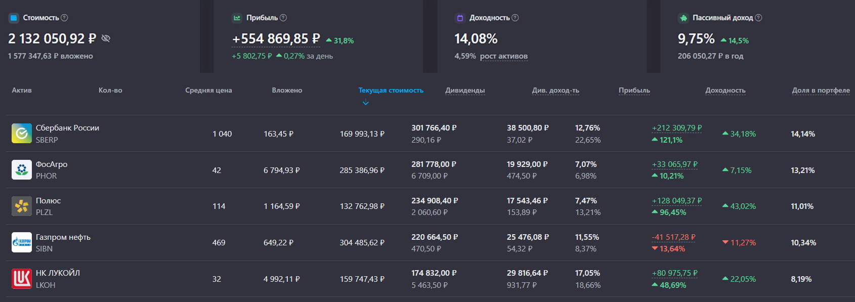 В мой портфель входят 4 брокера (Т-Инвестиции, А-Инвестиции, СберИнвестиции и БКС) и по состоянию на 1 октября 2025, сумма на всех счетах составляла 2 133 579 ₽.