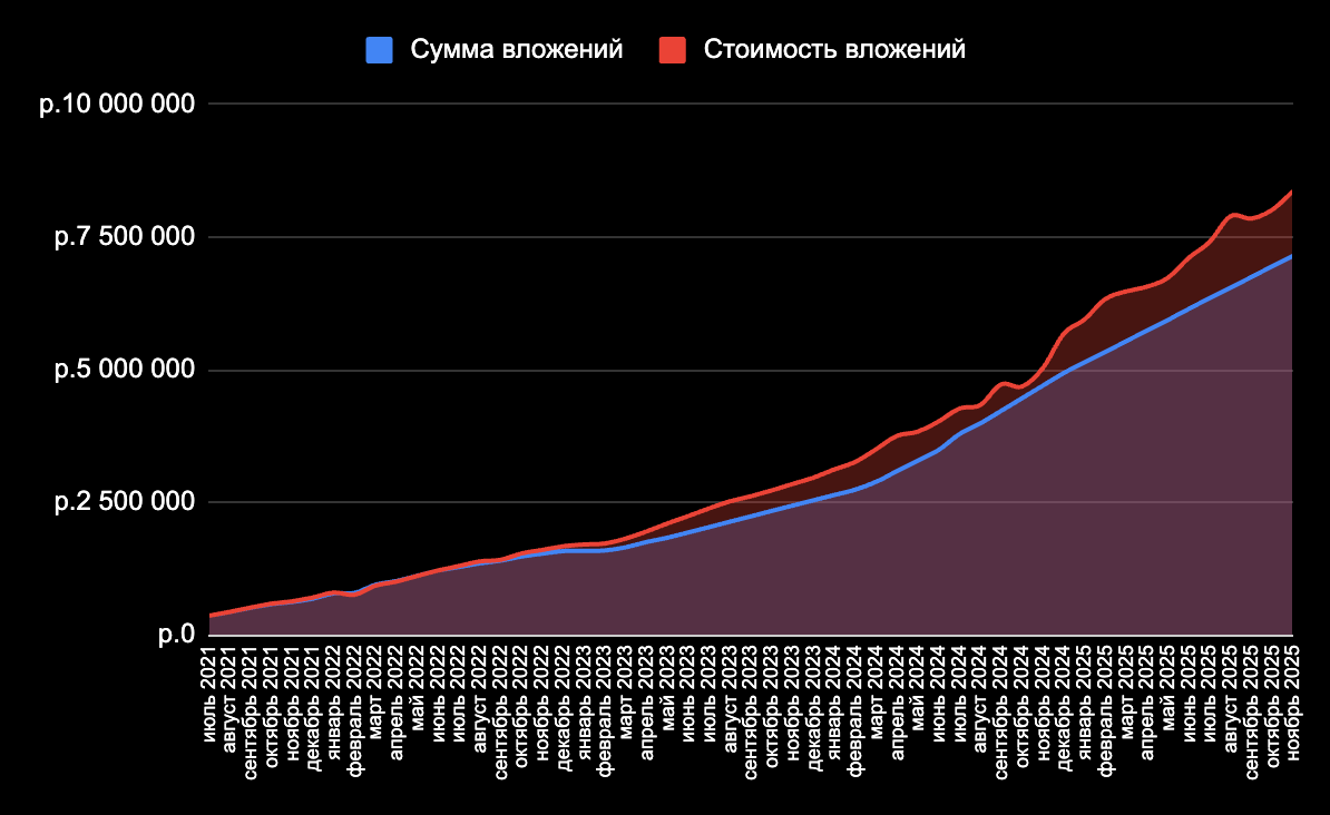 Биржевой: 6 725 688 + 200 000 (пополнение) +138 333 (рост) = 7 064 021 ₽