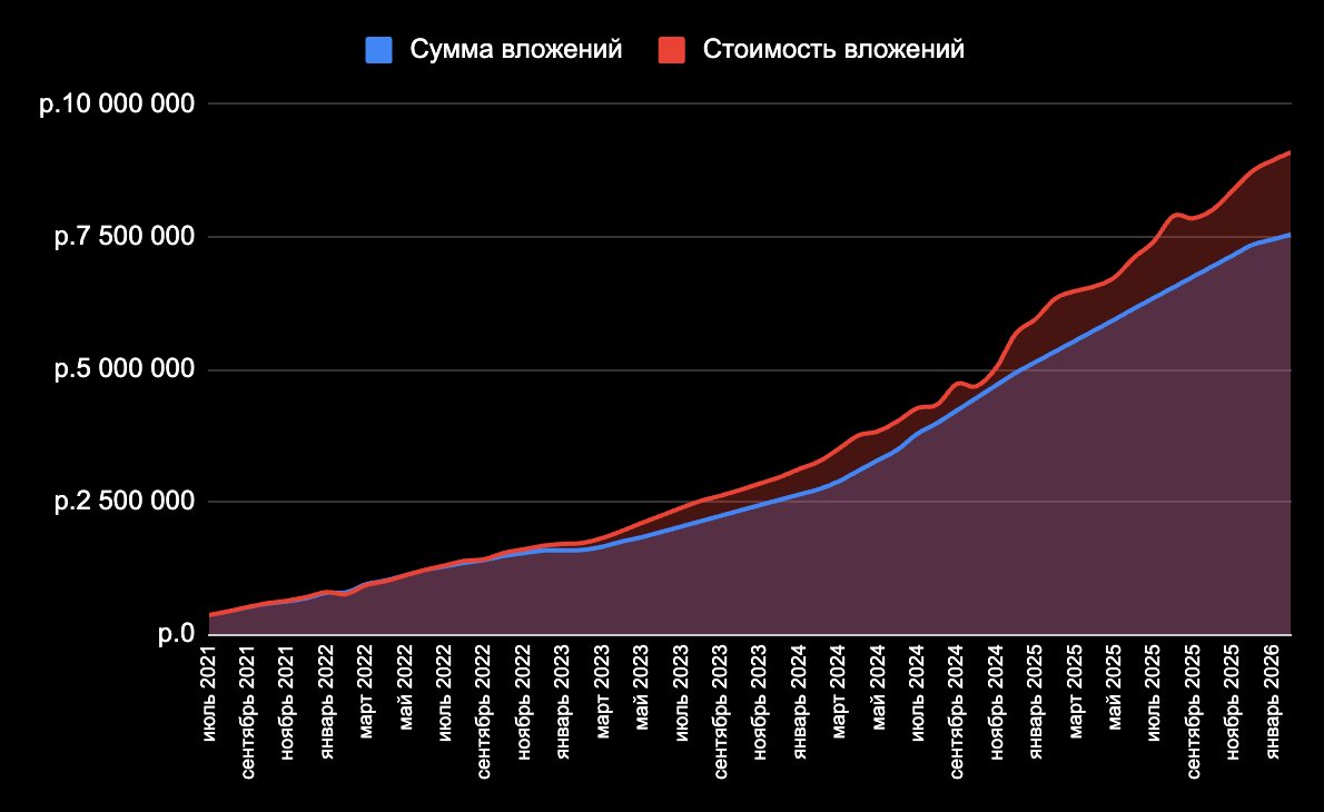 Биржевой: 7 591 387 + 100 000 (пополнение) +124 240 (рост) = 7 815 627 ₽