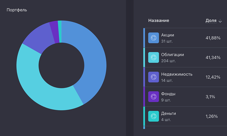Акции занимают 41,88% биржевого портфеля. Облигации 41,34%, недвижка 12,42%.
