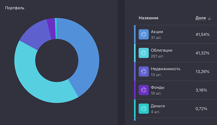 Акции занимают 41,54% биржевого портфеля. Облигации 41,32%, недвижка 13,26%.