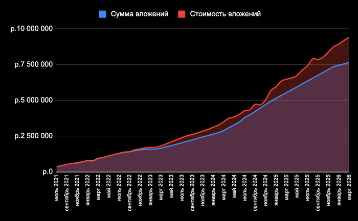 💼 Итоги 57 месяцев инвестиций. Портфель 9,414 млн рублей. Прибыль за март 136 тысяч
