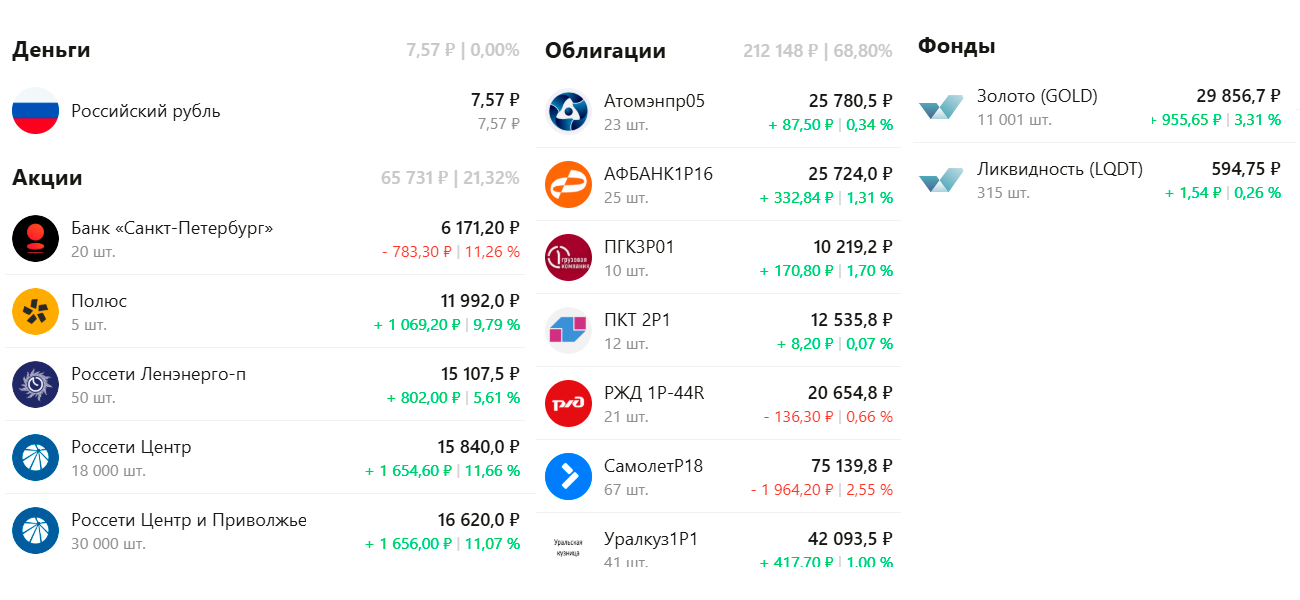 Доля акций составляет порядка одной пятой портфеля. В этом сегменте основной вклад в результат обеспечили сетевые компании: Россети Ленэнерго (LSNGP), Россети Центр (MRKC) и Россети Центр и Приволжье (MRKP). Также в портфеле присутствует Полюс (PLZL) как защитный актив, связанный с ценой на золото. Убыточная позиция в Банке Санкт-Петербург практически не оказывает влияния на портфель, и постепенно будет выводится из просадки дополнительными покупками.
